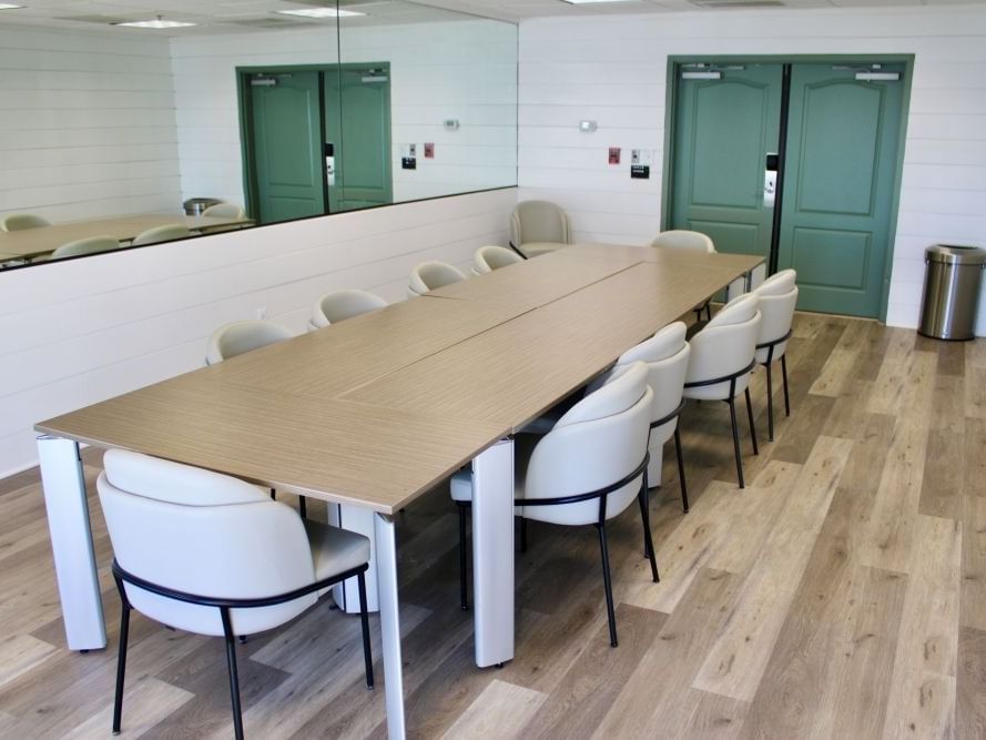 This boardroom is designed for productive, focused gatherings such as corporate meetings, planning sessions, and small presentations. With seating for approximately twelve, the space features shiplap walls that bring a subtle coastal charm, complemented by large windows overlooking the Chesapeake Bay. The natural light and waterfront view help foster a refreshing and engaging environment, while the room’s intimate scale encourages collaboration and conversation. A great setting for teams looking to meet in a space that balances professionalism with a relaxed, scenic atmosphere.