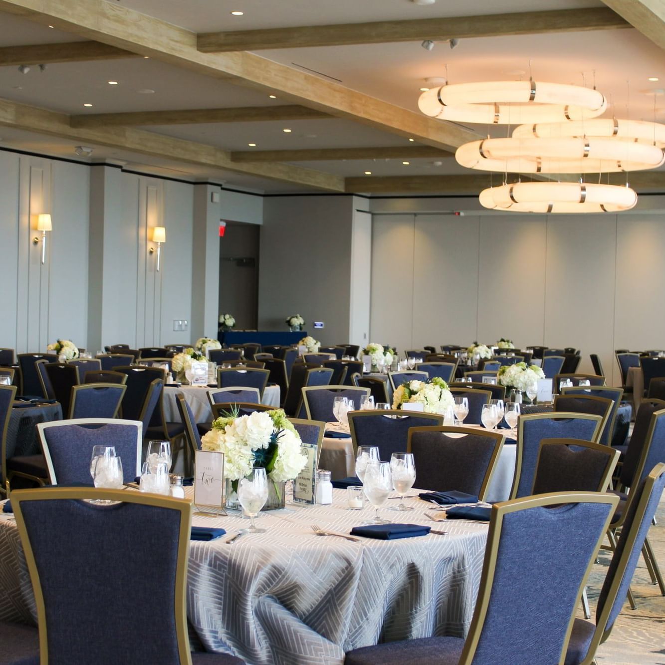 Elevate your next event in a versatile, light-filled space overlooking the scenic Chesapeake Bay. Designed to accommodate a variety of occasions—from corporate meetings and conferences to receptions and milestone celebrations—this modern venue offers flexible layout options to suit your needs. Floor-to-ceiling windows illumuminate the room in natural light while providing breathtaking views of the water, creating an unforgettable backdrop. The space can also be seamlessly divided into two separate rooms, making it ideal for both large and smaller, more private gatherings.